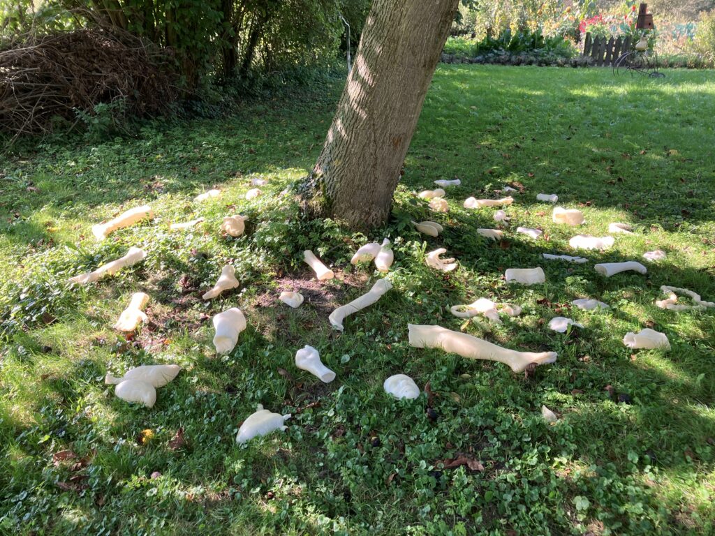 Tijdens de tentoonstelling bij het dijkmagazijn in Winsum (Beuningen) werd de installatie opnieuw opgebouwd rondom een boom.