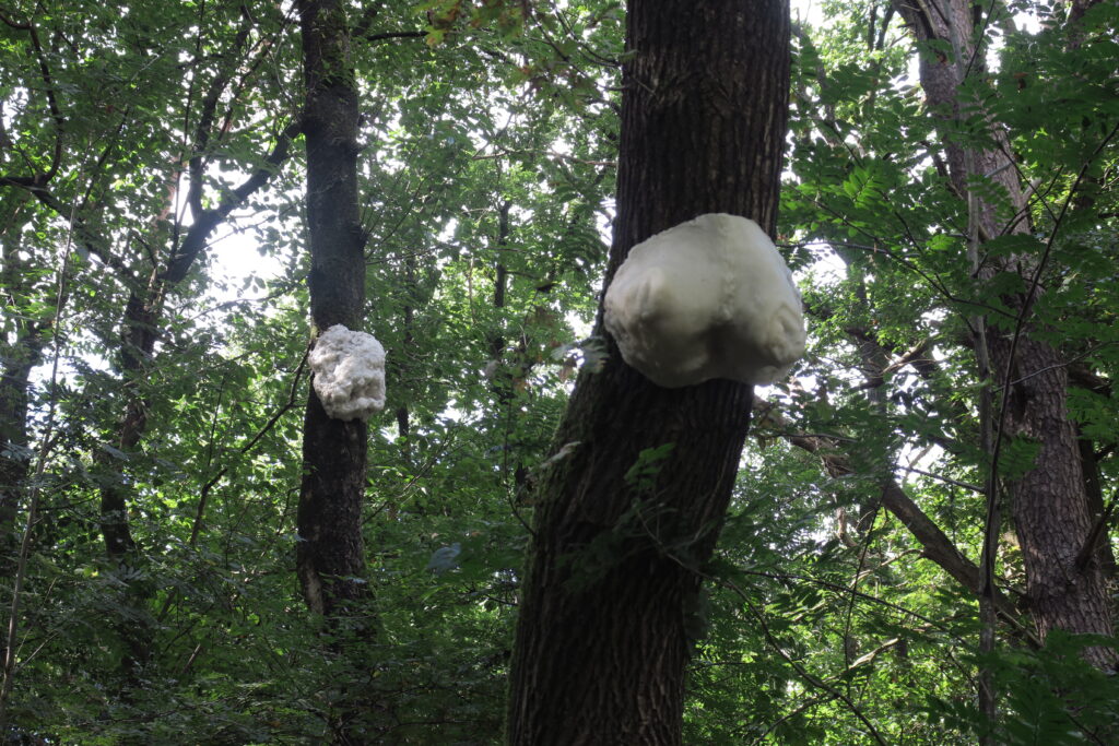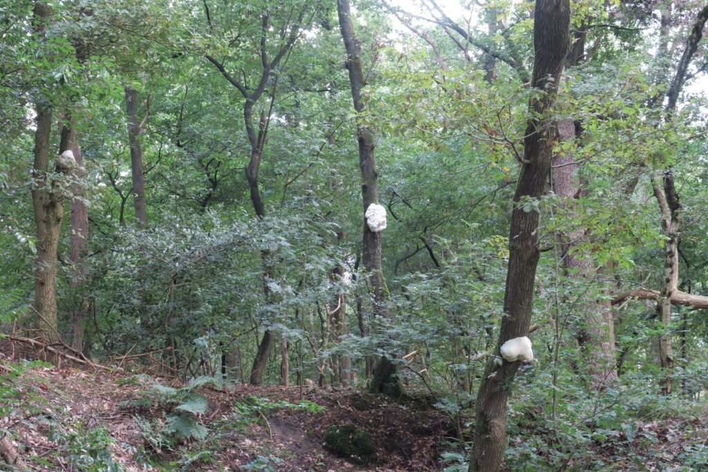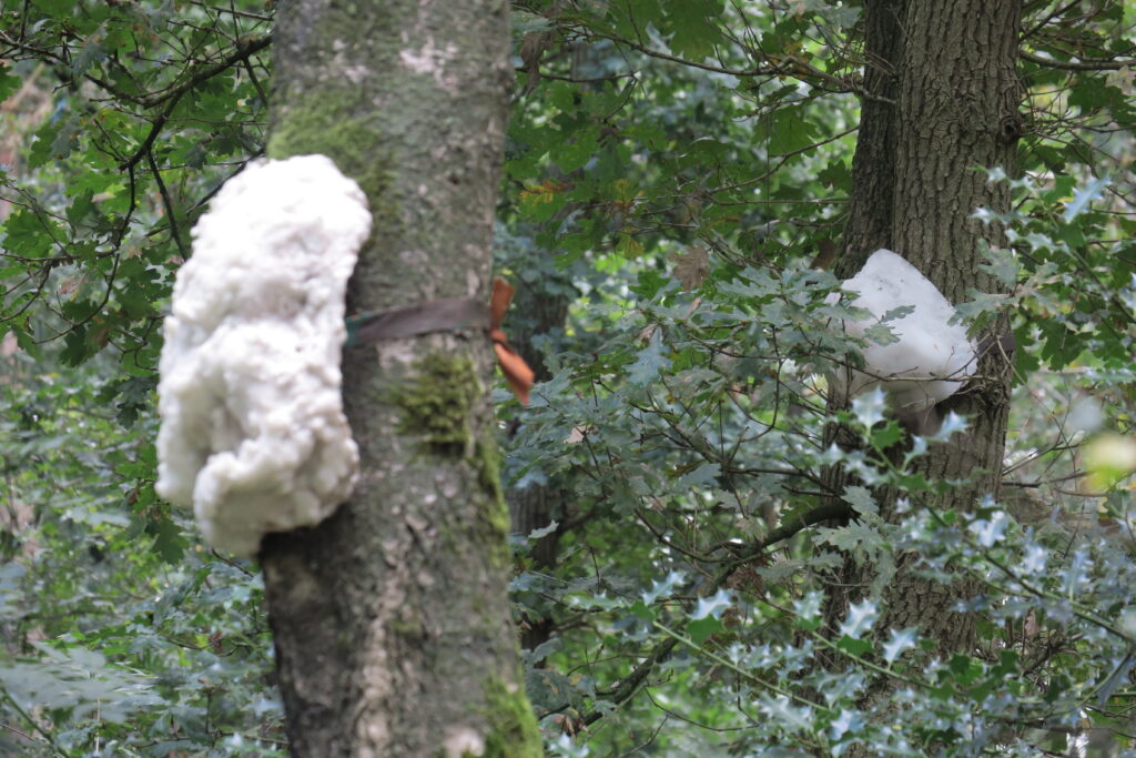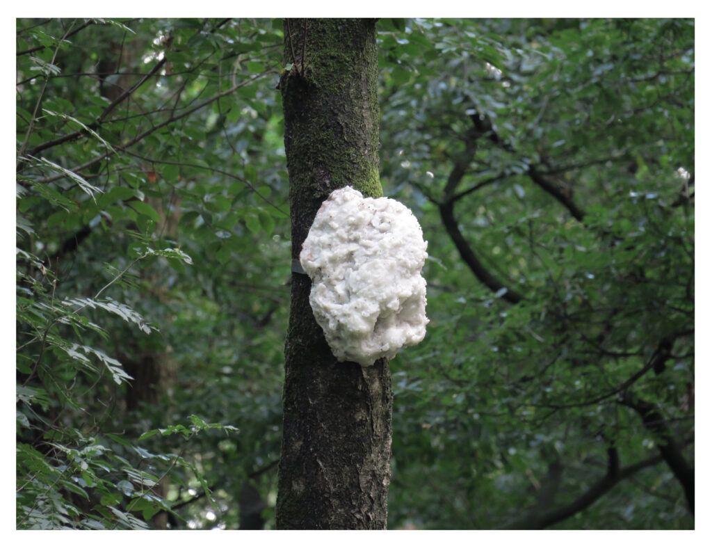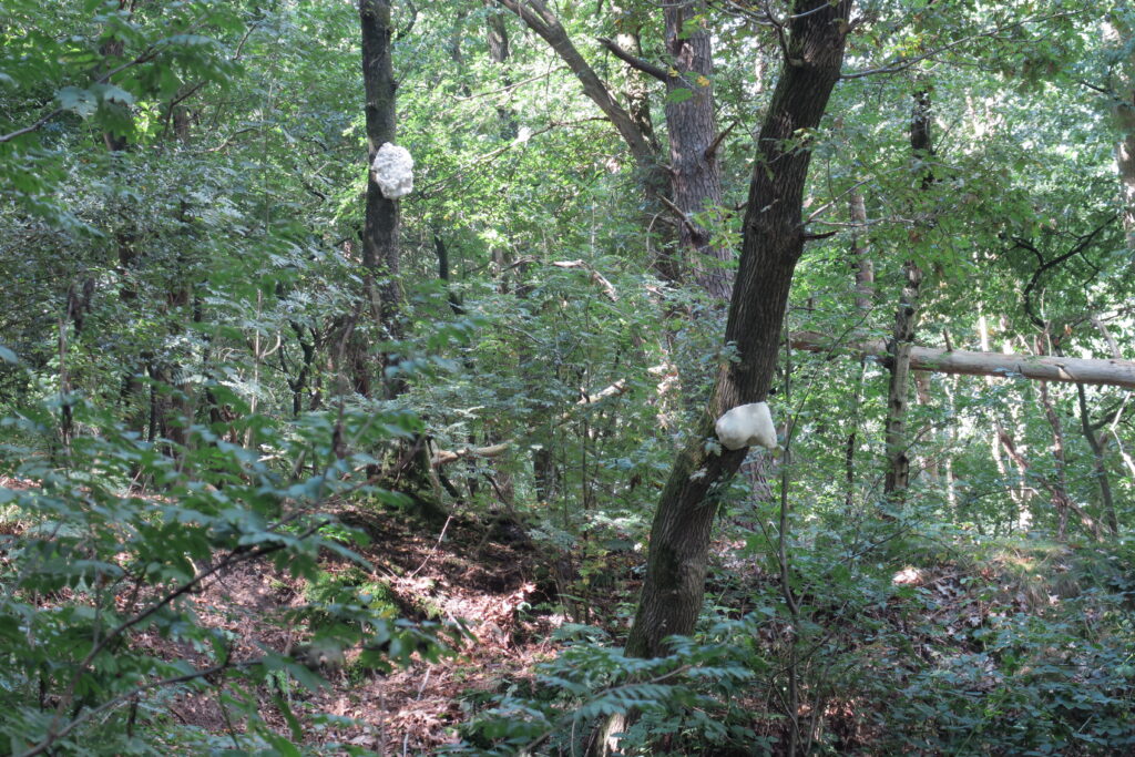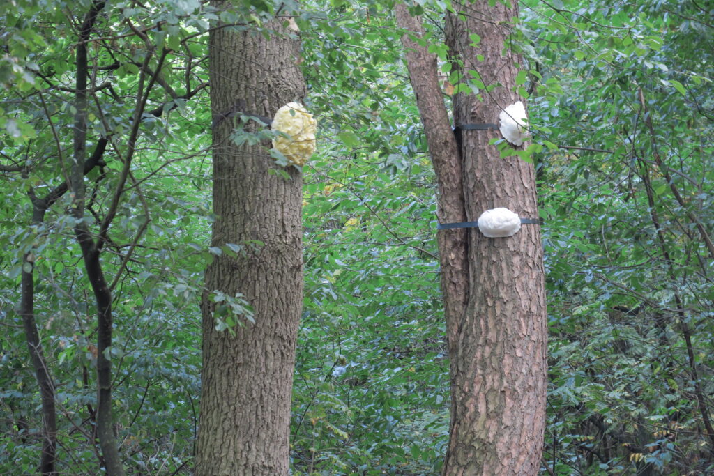 Lanters and Lee made silicone rubber molds and wax casts of various knots and attached them like ornaments to various tree trunks. The trees are arranged in a circle around an old gravel pit. The soft yellow color of the 25 objects is reminiscent of the underground mycelium network that allows trees to communicate with each other and is also known as the Wood Wide Web. We could easily imagine the trees using the tactile resin knots as instruments to make music with each other.